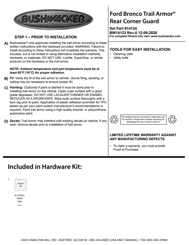 One of the greatest joys as a Jeep owner starts right where the road ends. Brush, limbs and the occasional What was that beat and slap at your vehicle. Emerge from the trail with your Jeep looking like it did when you got there. Bushwacker Trail Armor components for the Jeep Wrangler are made with rugged off-road durability and easy installation to transform your Jeep in minutes. Defend our Jeep with the kind of body protection that stands up to the test anytime, anywhere. Our Trail Armor comes with a Limited Lifetime Warranty and is installed with automotive-grade high bond tape and a no-drill process.