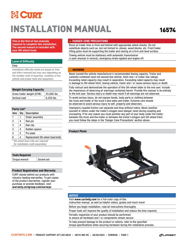 The CURT S25 slider makes it easy to tow a 5th wheel trailer with your short-bed truck. This slider features a quiet design, an auto-latching mechanism, an ergonomic handle and industry-standard mounting points. The S25 sliding 5th wheel hitch is built with a solid design to eliminate chucking in the towing position and promote smooth rolling from forward to rearward positions, with no binding. With the S25 installed, you can safely move the coupling point 12 inches toward the rear, allowing your short-bed truck to make turns without obstruction. The S25 slider is comfortable and easy to operate, featuring a lift-style lever that is easily accessible over the side of the truck wall. The lever moves in a more user-friendly, ergonomic motion compared to traditional, pull-out-style levers. Best of all, the S25 automatically latches into place in both directions, meaning you only have to get out of the truck once to complete the operation. Simply set the lever, pull the truck forward and you're ready to maneuver. The auto-latches will lock the slider into the rearward coupling position. The S25 sliding 5th wheel is rated for trailers up to 25,000 pounds, and it is fully tested to SAE J2638 specifications. It comes with standard mounting points to easily mount onto all industry-standard base rails.
