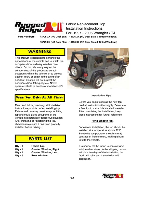 New XHD Replacement Soft-Tops from Rugged Ridge now available! Each Fabric Soft Top is designed to easily fit the factory original soft top hardware. Simply take off the old top and slip on the new. It s just that easy! These new designs feature reinforced stitching on the heavy pull areas and heavy duty 30 mil thick glass! All XHD Soft Tops boast 20 oz durable vinyl coated polyester and cotton fabric that last the test of time. All sewn seams use marine grade thread to make sure it does not deteriorate or discolor in the sun. Each seam is literally welded shut with durable heat seal tape to keep moisture out while keeping the original look of the top intact. Attaching the Rugged Ridge Top is easy with the factory original belt rail attachment method; simply tuck under the rail and go! All our tops feature 2 choices of door options as Jeep offered the 97-06 Wrangler with upper soft doors or with full hard doors. Rugged Ridge makes a Replacement Top that fits either! Each top is backed by an industry leading 5 year limited warranty against manufacturer defects.